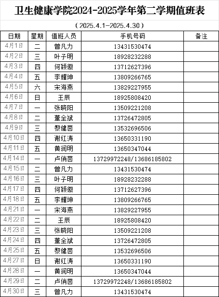 太阳成集团tyc122cc2024-2025学年第二学期值班表(4月)