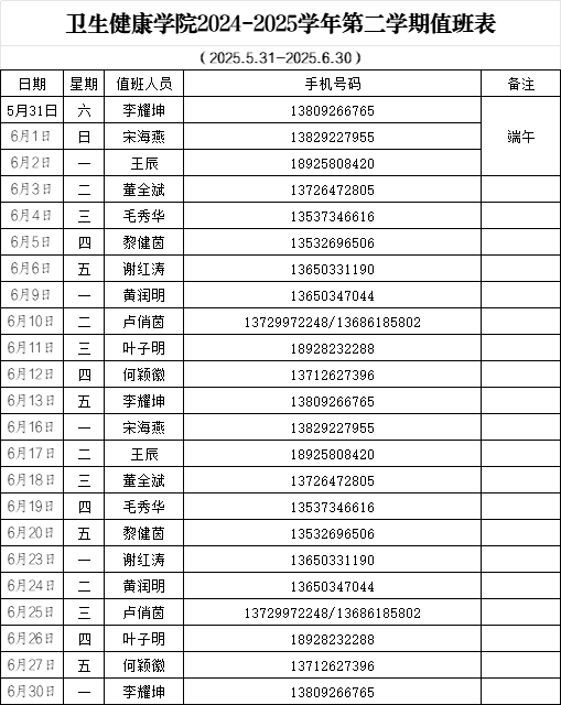 太阳成集团tyc122cc2024-2025学年第二学期值班表(6月)