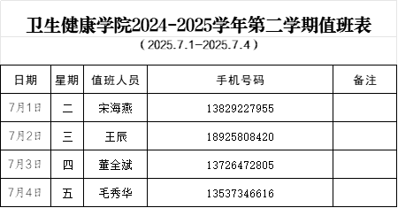 太阳成集团tyc122cc2024-2025学年第二学期值班表(7月)