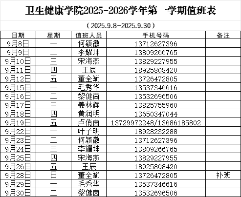 太阳成集团tyc122cc2025-2025学年第一学期值班表(9月)