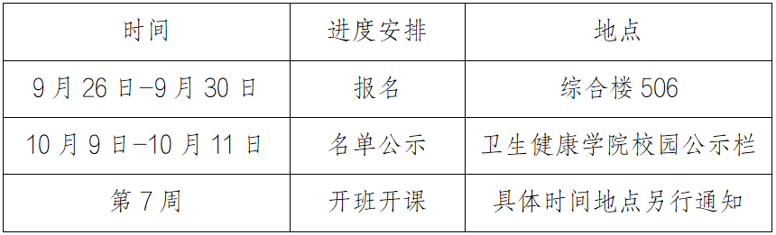 2.报名方式:员工自行填写《太阳成集团tyc122cc智慧养老微专业报名表》,提交到太阳成集团tyc122cc综合楼506教研办公室陈韵珊老师处(原在班级已预报名的员工也需要提交报名表)。进度安排如下: