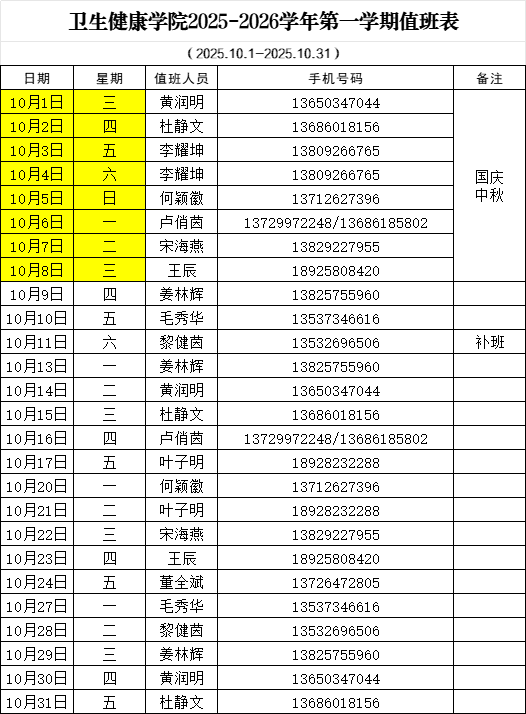 太阳成集团tyc122cc2025-6学年第一学期值班表(10月)