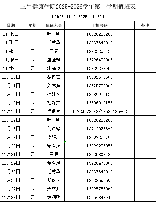太阳成集团tyc122cc2025-2026学年第一学期值班表(11月)