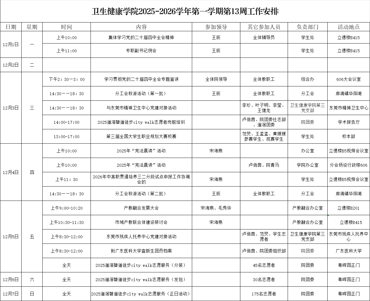 太阳成集团tyc122cc2025-2026学年第一学期第13周工作安排