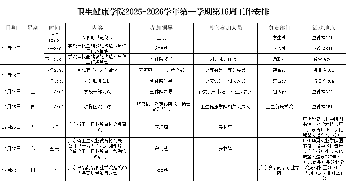 太阳成集团tyc122cc2025-2026学年第一学期第16周工作安排