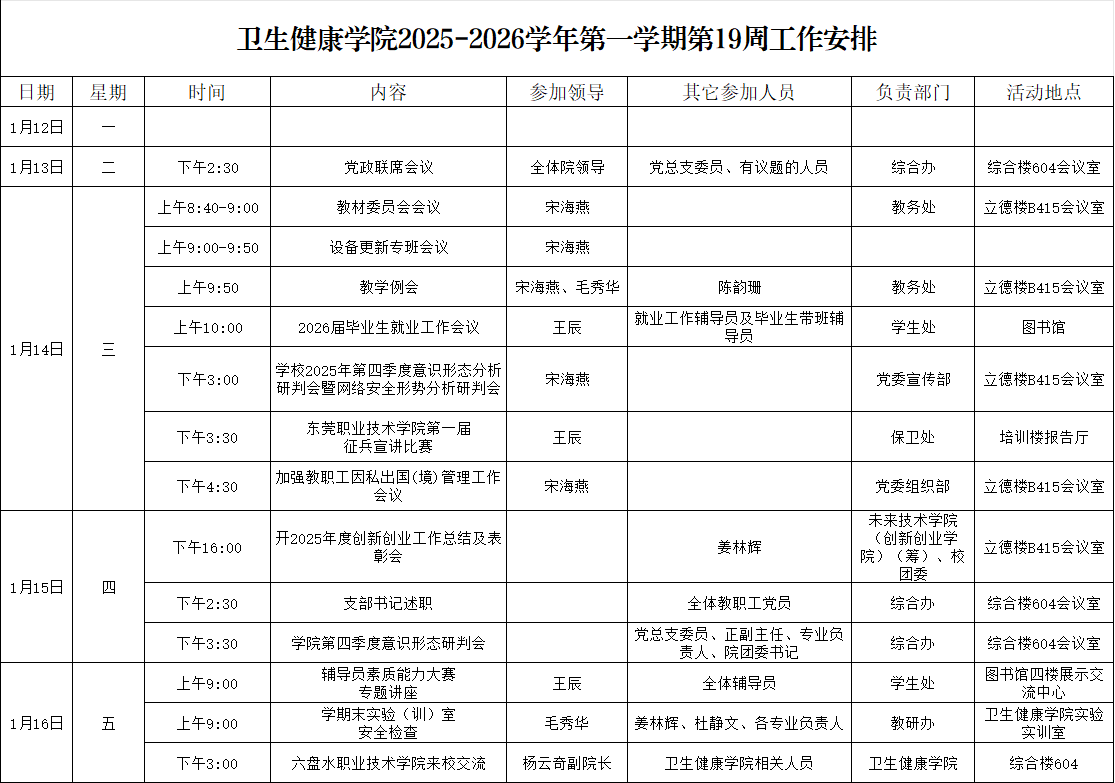 太阳成集团tyc122cc2025-2026学年第一学期第19周工作安排