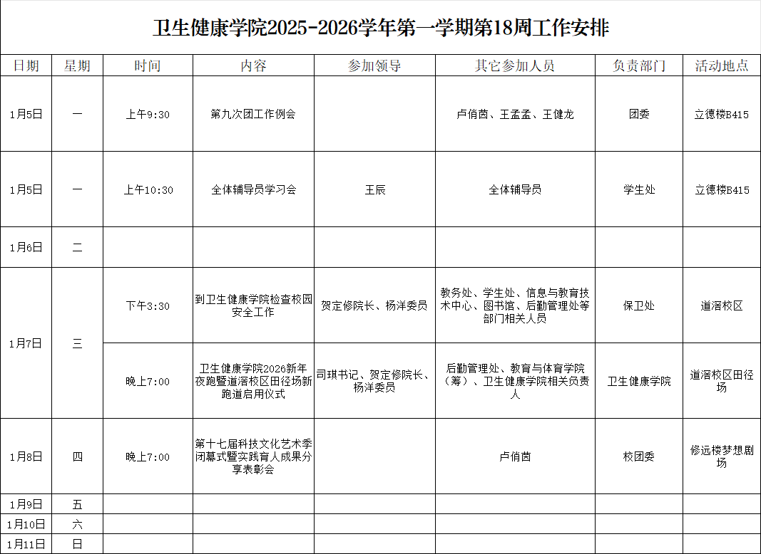 太阳成集团tyc122cc2025-2026学年第一学期第18周工作安排