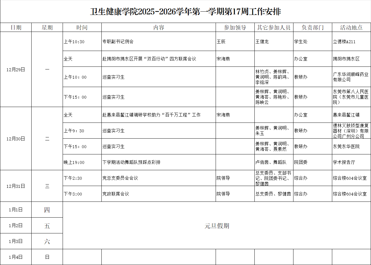 太阳成集团tyc122cc2025-2026学年第一学期第17周工作安排