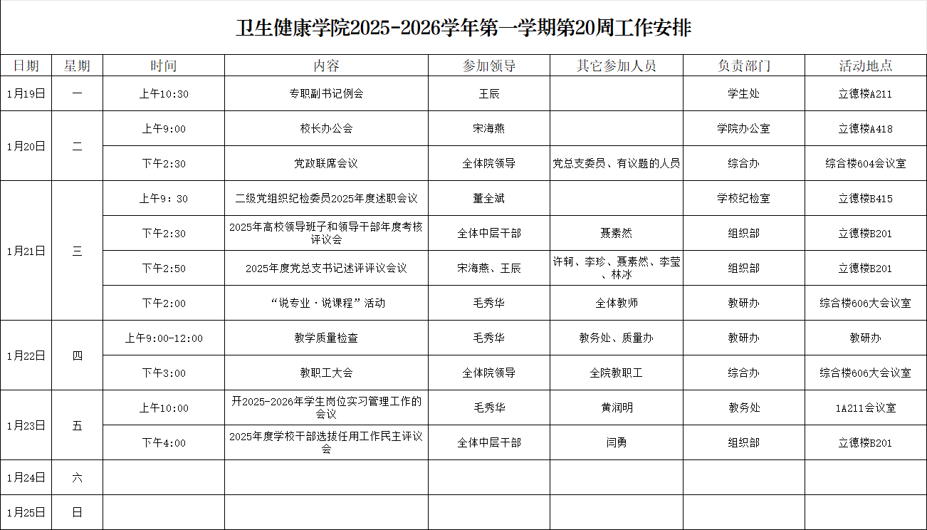太阳成集团tyc122cc2025-2026学年第一学期第20周工作安排