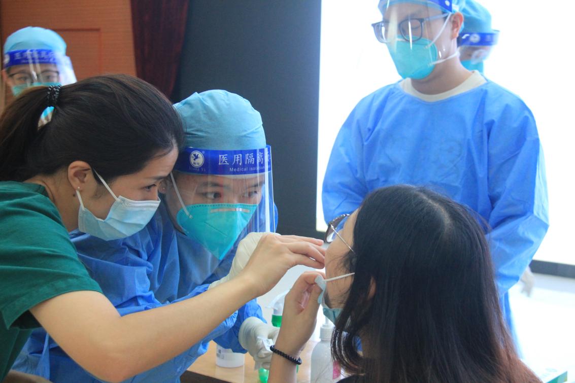 医护人员指导现场志愿者如何规范采样