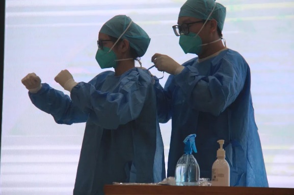 医护人员演示如何正确穿戴隔离衣以及脱下隔离衣