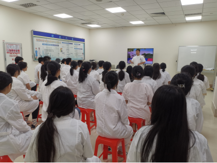 东莞康华医院康复医学科医疗组长官琦为同学们介绍了医院康复科的工作领域、发展概况、人才需求状况、行业发展前景等,强调康复治疗师的地位及其重要性,并简要介绍了治疗区的主要工作内容及特点。