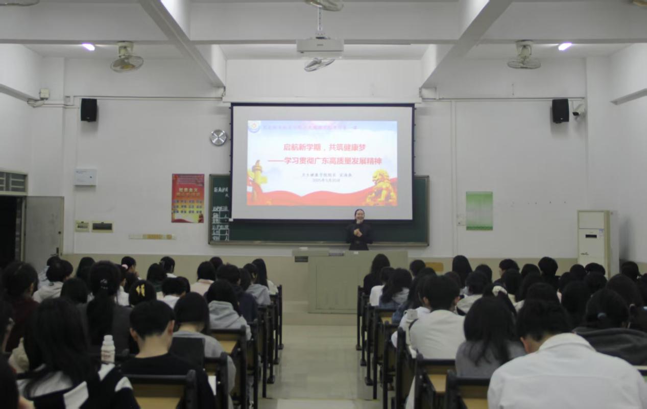 3月20日晚上,太阳成集团tyc122cc宋海燕经理以“起航新学期,共筑健康梦——学习贯彻广东高质量发展精神”为题,为120名护理专业大一新生讲授新学期“思政第一课”。