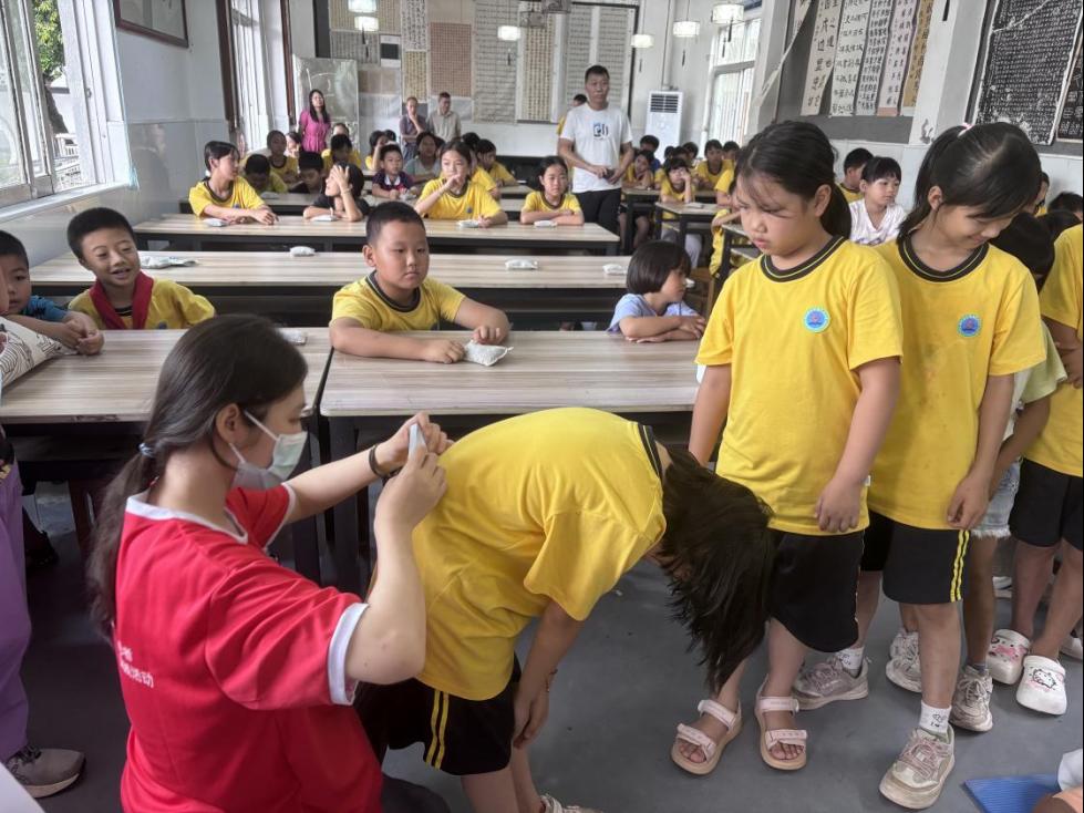 期间,突击队创新推出“场景模拟+一对一纠正”的培训模式,用当地方言教学,使100余名村民和镇村干部掌握了心肺复苏技能和脑卒中BEFAST口诀,有效提升了基层应急救护能力。在江湾镇中心小学,队员们用专业脊柱侧弯测量仪为全校员工筛查,发现3例可疑早期侧弯,并将名单转交公司跟进。获校方高度评价:“卫健院师生的专业筛查为早干预抢出了关键时间!”