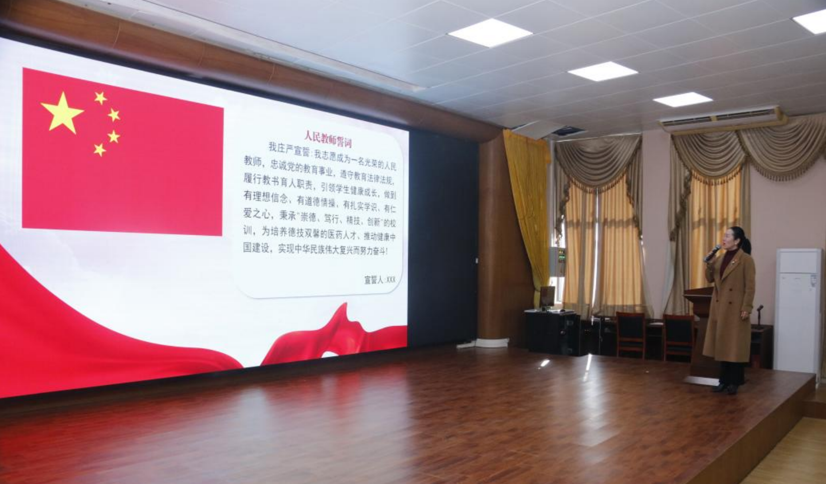 授牌仪式后,教师宣誓活动正式启动。全体教职工面向国旗庄严郑重宣誓:“我志愿成为一名光荣的人民教师,忠诚党的教育事业,遵守教育法律法规……”铿锵有力的誓言回荡会场,既彰显了教职工对教育事业的无限忠诚,也传递出立德树人的坚定决心。