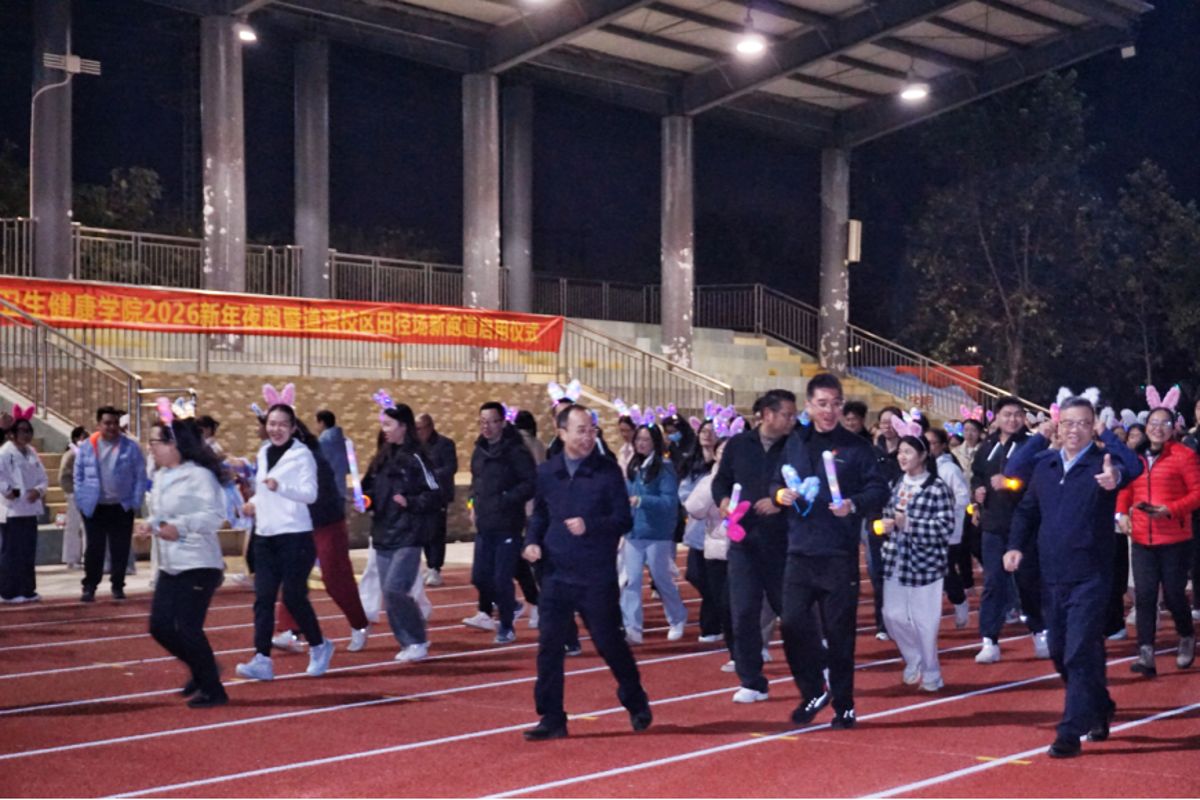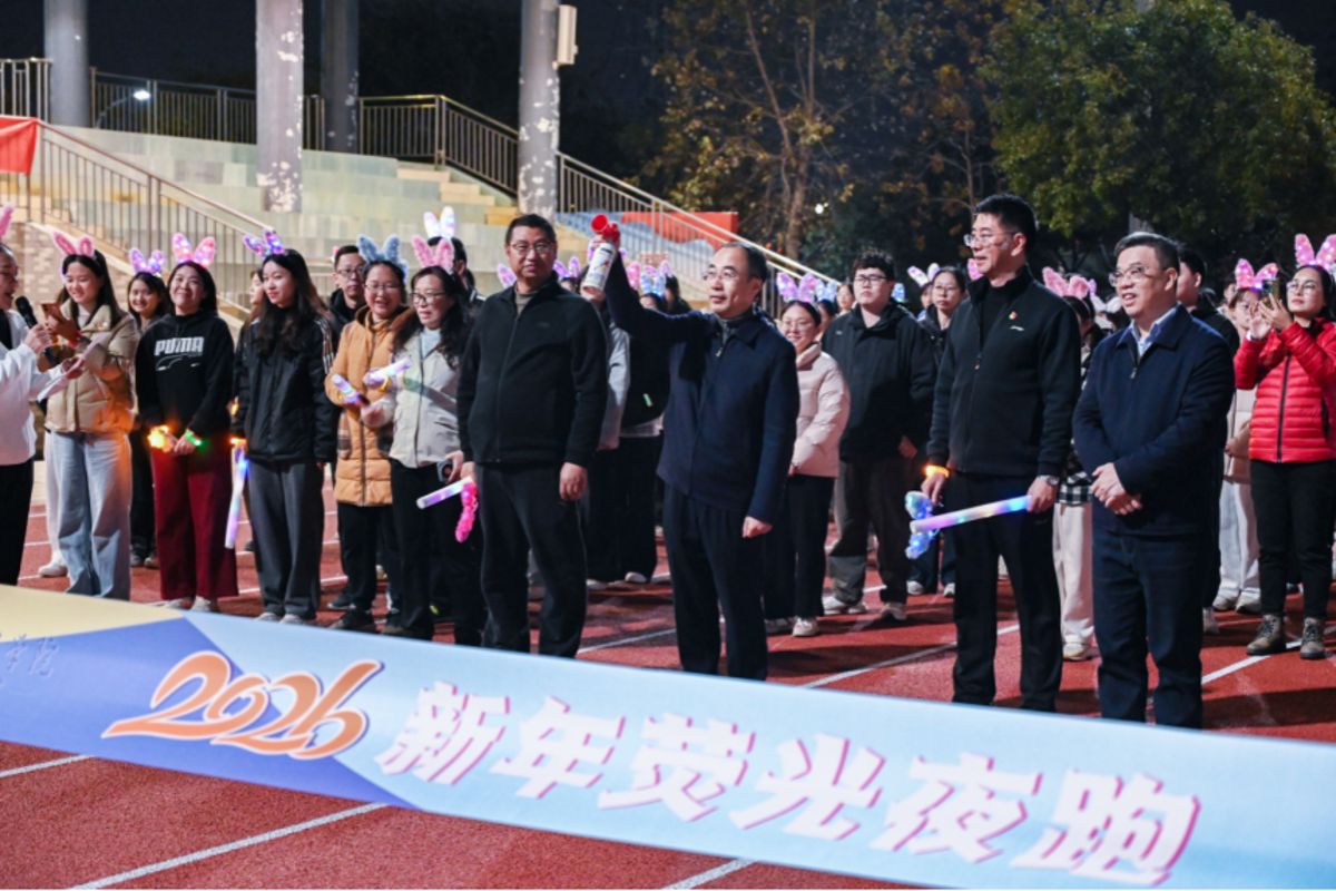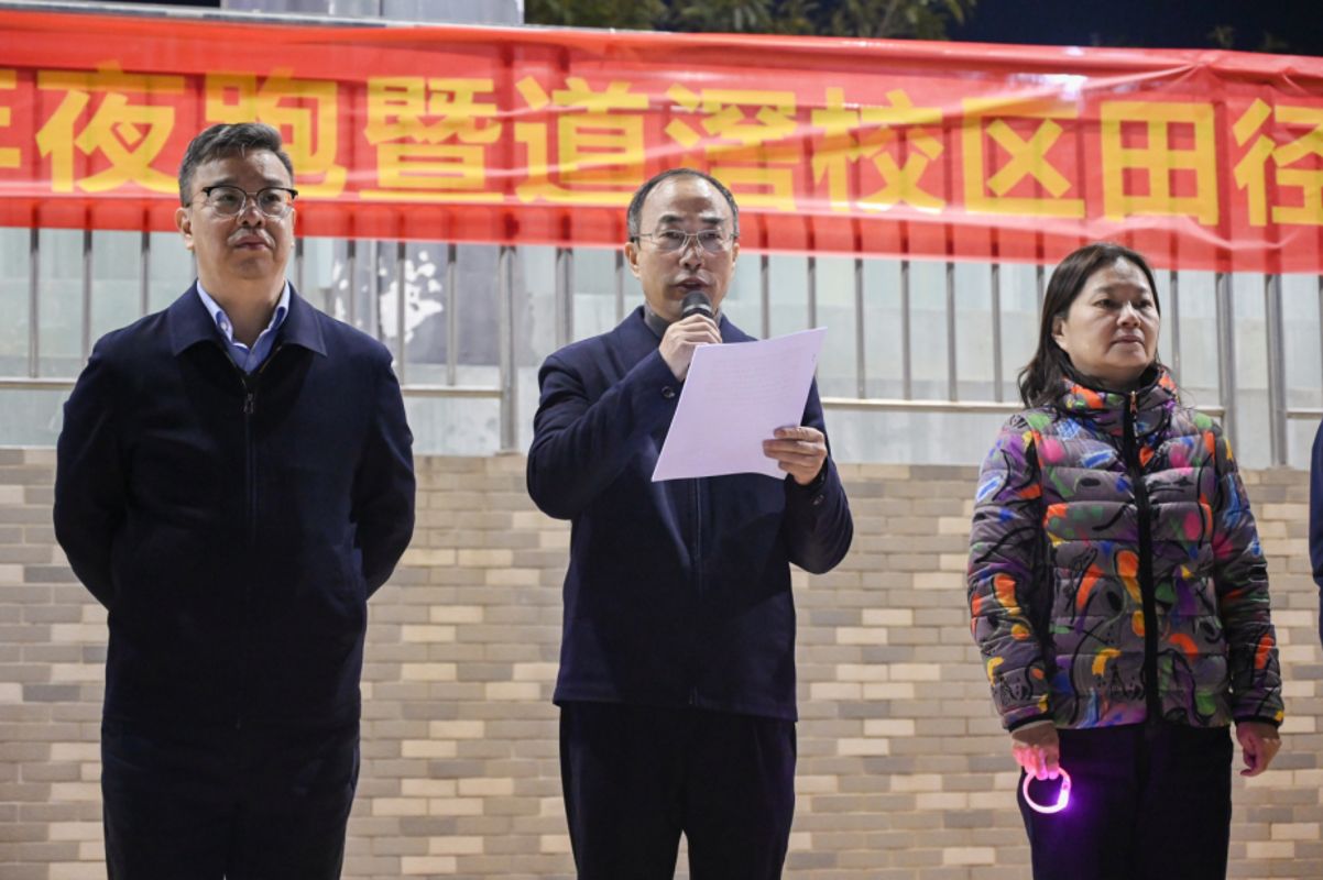 讲话结束后,贺定修院长打响夜跑发令枪,并带领现场师生们一同在崭新跑道上开跑。道滘校区田径场灯火璀璨,师生们身上的荧光手环、荧光发带随步伐流转闪烁,大家精神抖擞、步履铿锵,绘就了校园新年最鲜活灵动的画卷。