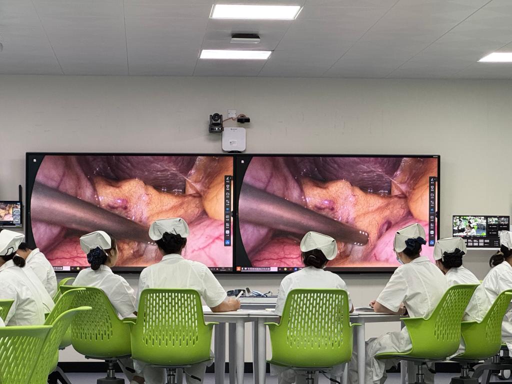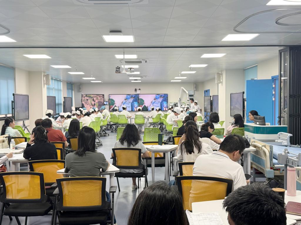 直播中,叶锡银主任同步解析人体解剖结构,洪雪飞护士长强调无菌原则操作要点,校方教师实时穿插理论剖析,双方协同解答员工疑问,形成“真实场景直播+双师解析+即时互动”的立体教学模式,有效破解了传统实训中手术室资源受限、员工实操观摩机会少的难题。